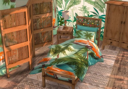 В этом наборе представлены такие предметы для спальни: односпальная кровать, подушки, столик, картина, шкаф, шторы, декорации.