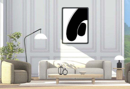Гостиная в стиле минимализма. Включены такие объекты: два дивана, кресло, кофейный столик, угловой столик, настольная лампа, торшер, картина, свечи.