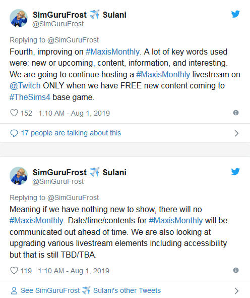 О предстоящих выпусках стримов продюсеры будут сообщать заблаговременно. Также возможны изменения того как проходят данные трансляции, но точной информации по этому поводу пока нет. Как и раньше, Maxis Monthly будет сообщать о новинках в серии The Sims.