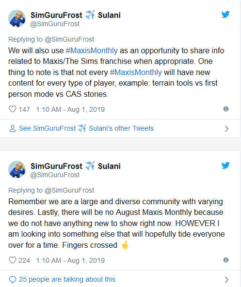SimGuruFrost сообщил в твиттере об изменениях в трансляциях ежемесячных стримов Maxis Monthly. Теперь эти стримы не будут проходить в начале каждого месяца - новые выпуски будут происходить в случае, когда будут добавляться новинки в базовую игру. В августе не будет нового выпуска, а это означает, что ничего нового в этом месяце мы не получим для базовой игры. Однако стоит ожидать некую информацию (новый каталог? - прим. авт.).
