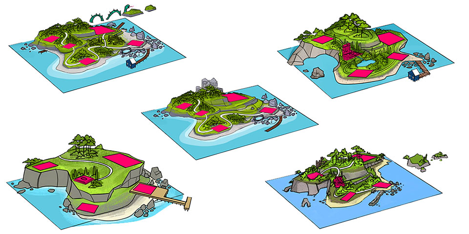 Когда мы определились с эстетической стороной и выяснили, как это будет выглядеть в детализированном виде, мы решили взглянуть на общую картину. Вот как мы хотели, чтобы выглядела карта, и кстати это очень похоже на то, что вы увидите в игре! На пирсе в деловом районе есть смотровая площадка, откуда вы можете увидеть очертания всех отдаленных районов — сельскую местность вдалеке с холмами, соснами и ветрогенераторами, старый город с причудливыми зданиями в стиле эпохи Тюдоров и перепрофилированными рыбными заводами и современный жилой остров, который расположен в центре винденбургского озера.