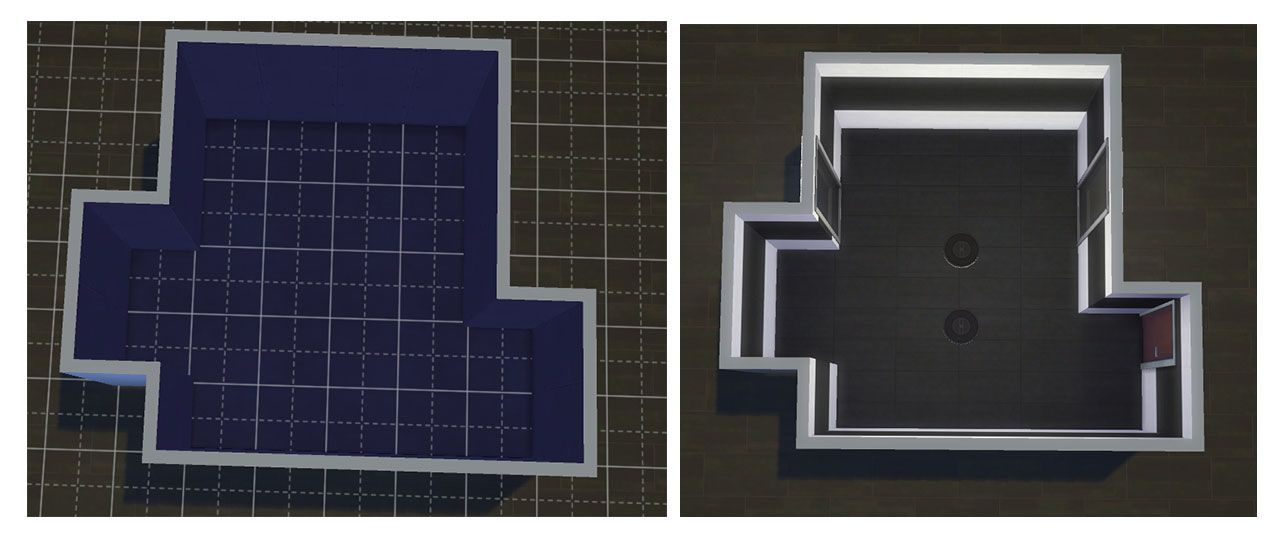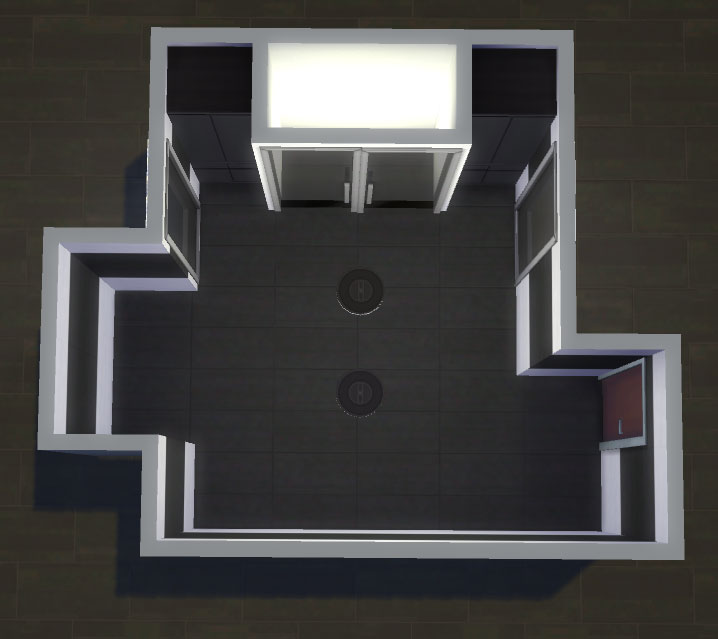 Шаг 2. Используйте перегородки и стены. После того как вы определились с формой, начните разделять комнату на участки и не забудьте про встроенный гардероб. Вы уже разметили участок для туалетного столика, поэтому мы сконцентрируем внимание на месте для встроенного гардероба. Разместите два шкафчика в современном стиле «БландКо» в каждом углу у стены, как показано на изображении ниже. (Эти шкафчики находятся на вкладке кухонных шкафчиков). Поставьте между ними стену размером 2x2, тем самым разделив их, и добавьте на переднюю стену одну-две стеклянные двери.