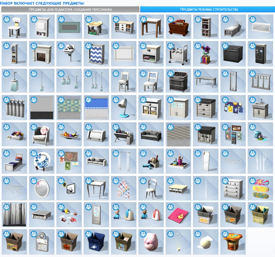 Ниже вы можете увидеть изображение со всеми предметами из режима создания симов:
