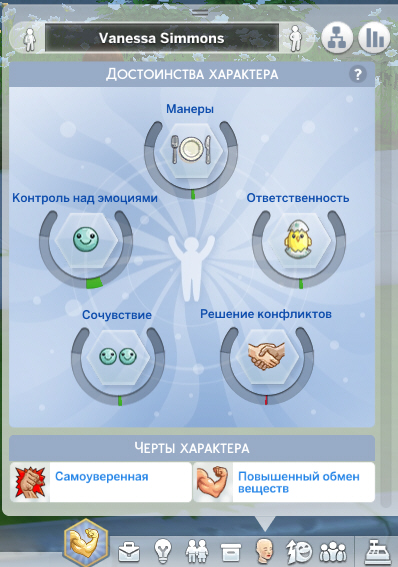 Достоинства характера заметно влияют на жизнь симов. К примеру, ответственные симы легче продвигаются по карьерной лестнице. А симы с плохими манерами постоянно попадают в неловкие ситуации во время общения с другими персонажами.