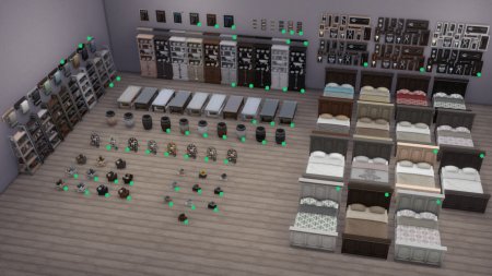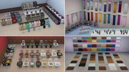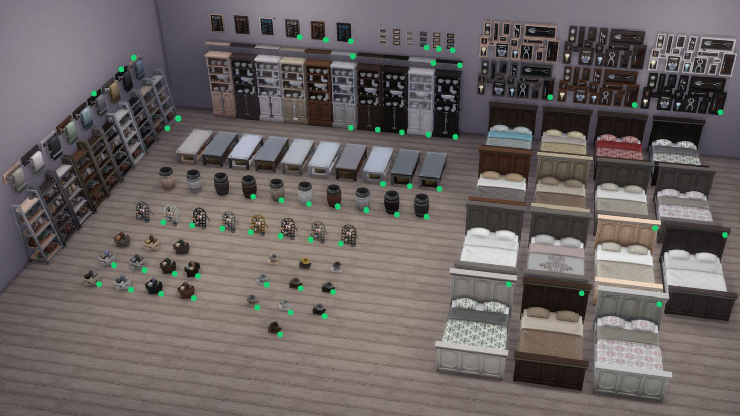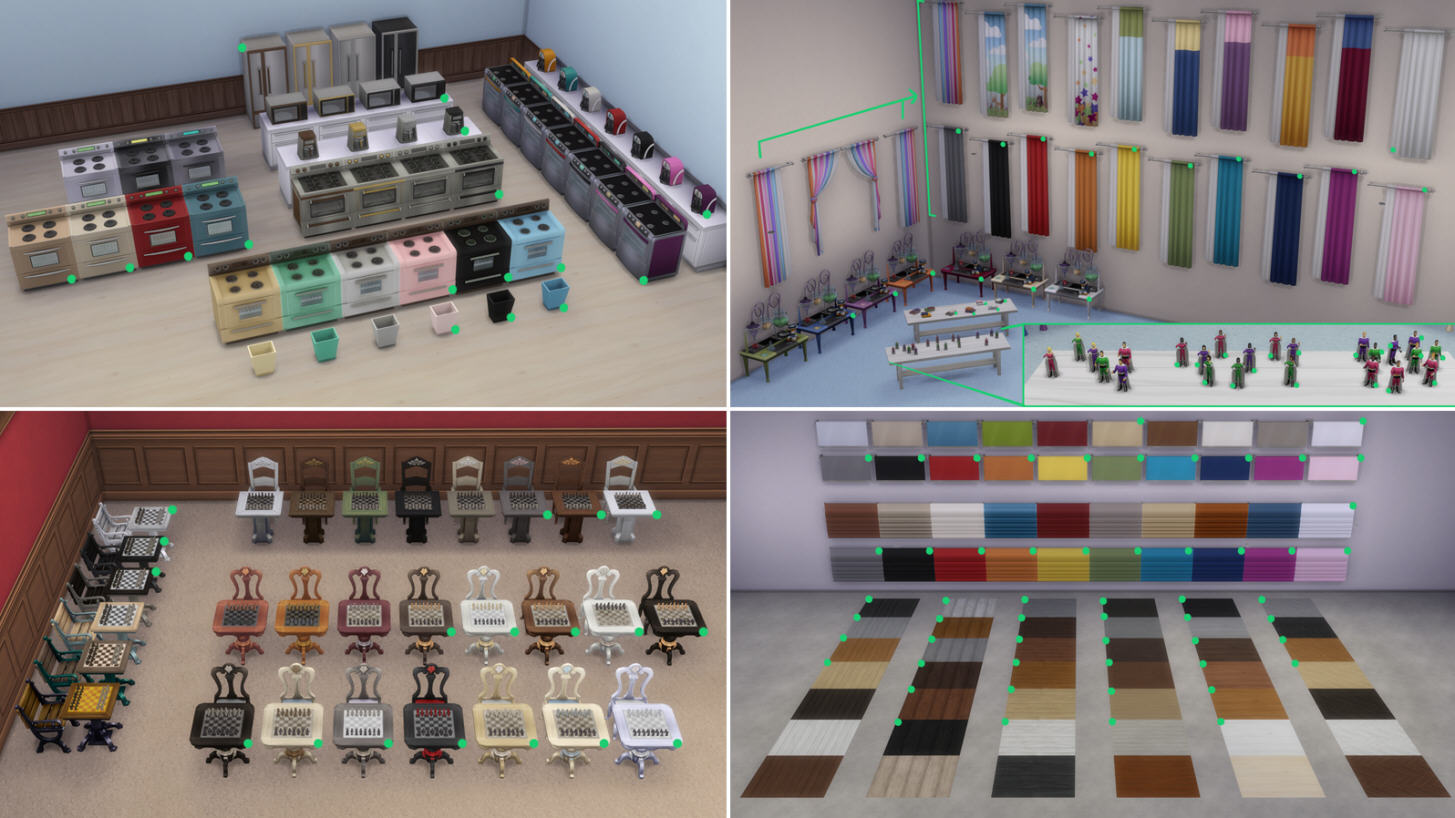 Я перечислю названия и приложу изображения всех предметов, для которых были добавлены новые цветовые гаммы. Огромное спасибо SimGuruBeth за то, что она сделала эти потрясающие снимки экрана! На этих снимках экрана вы заметите стрелки и зеленые точки, которые обозначают новые цветовые гаммы.