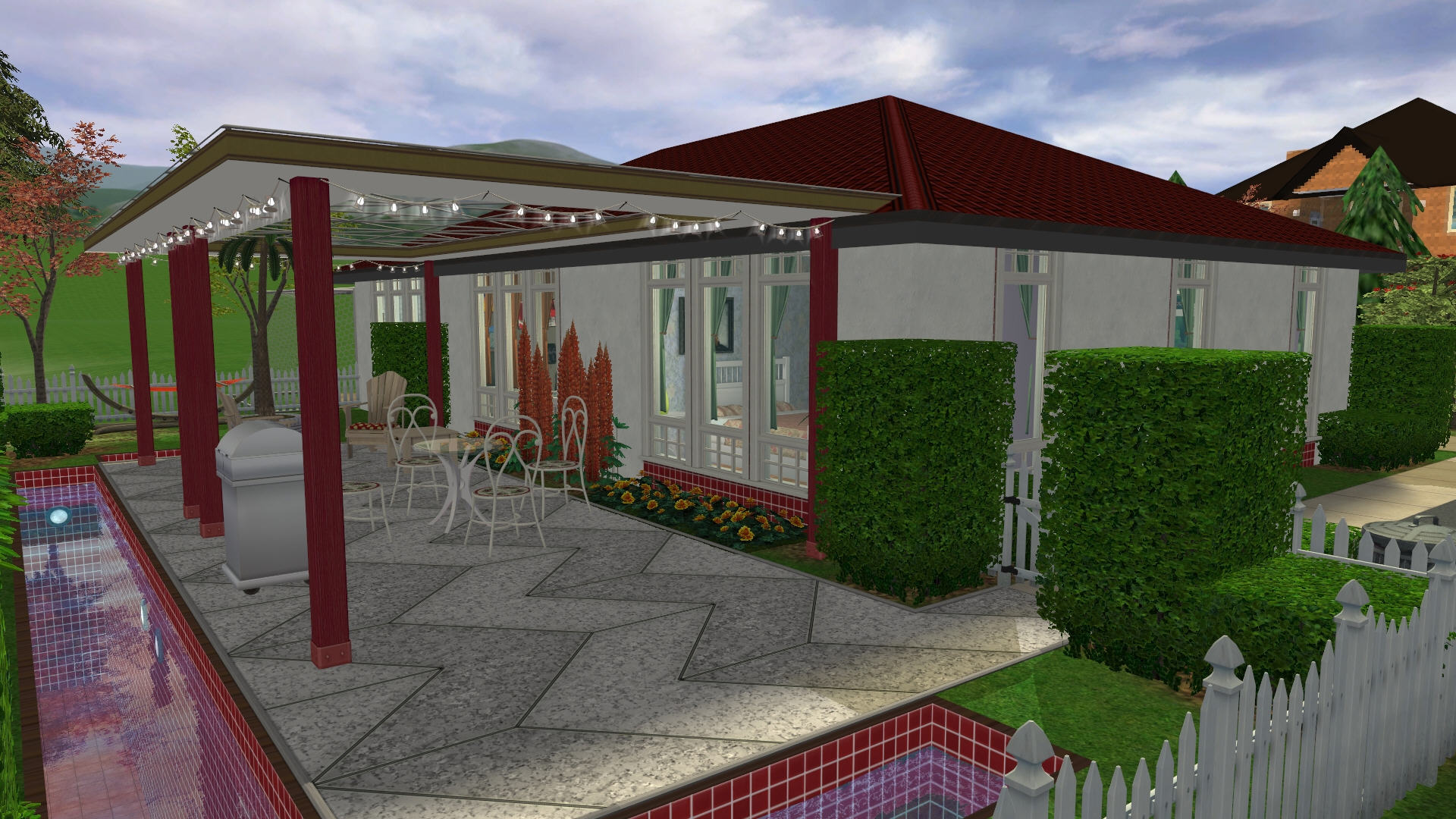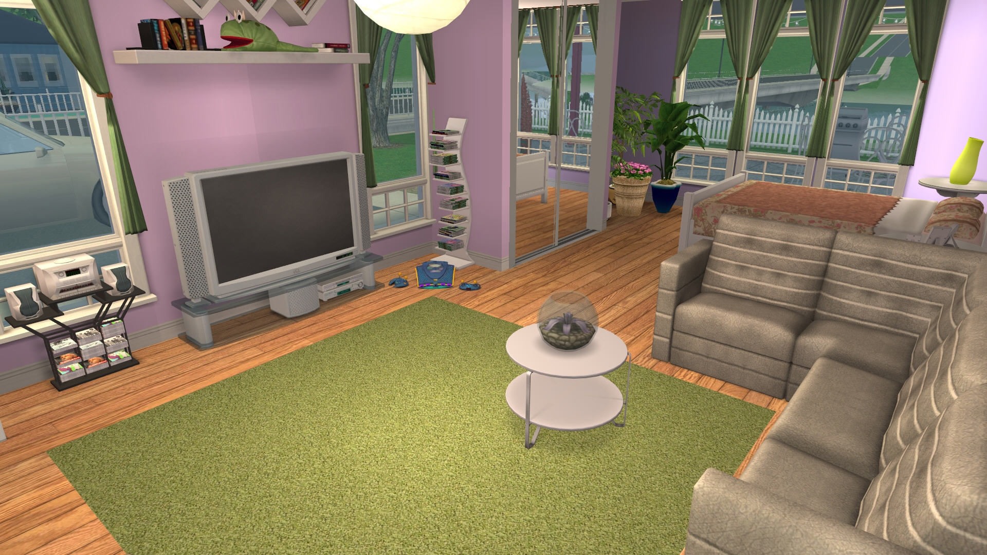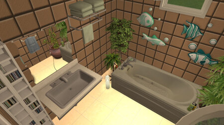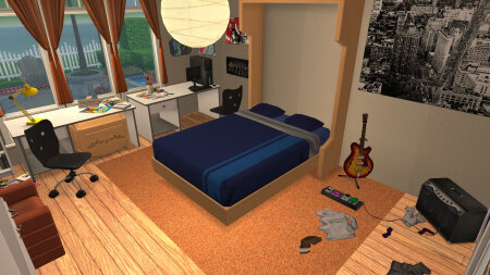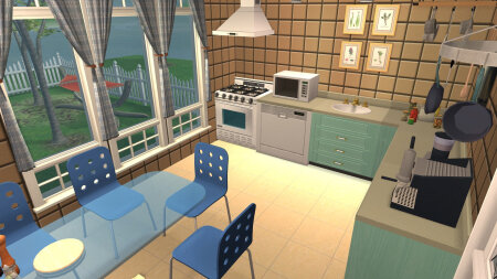 Небольшой дом для пары персонажей или родителя-одиночки с одним-двумя детьми. Имеются две спальни (одна совмещена с гостиной), санузел и все необходимое для комфортной жизни. Построен на участке размера 3х3. Стоимость 86 тыс. симолеонов.