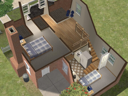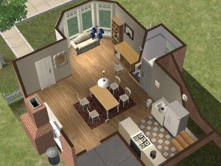Небольшой недорогой домик для двух-трёх персонажей. Имеются две спальни и один санузел. Кухня объединена с гостиной и столовой. Дом построен на участке размера 1х2. Стоимость 19,9 тыс. симолеонов.