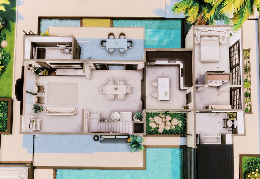 Современный дом с тремя спальнями и тремя санузлами. Построен на участке размера 30х30. Стоимость 154 тыс. симолеонов.